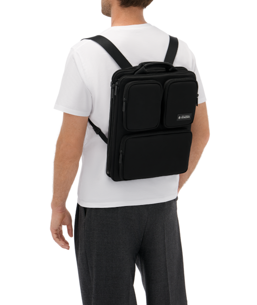Two top handles and zipped side panels connect the two sections, allowing the Luggage Harness Backpack to be carried by hand as well.