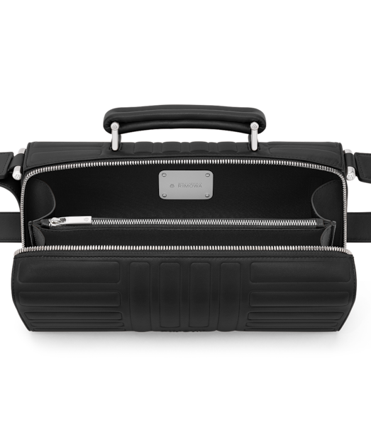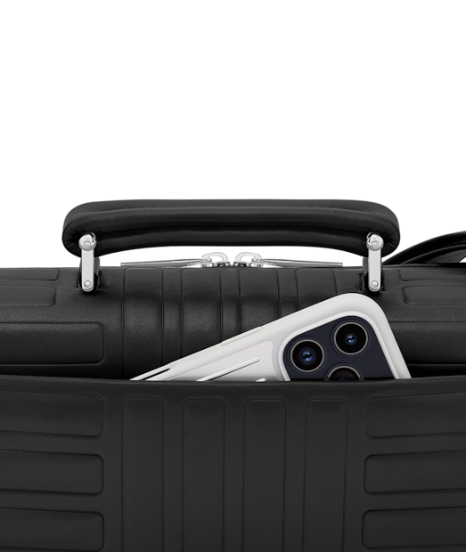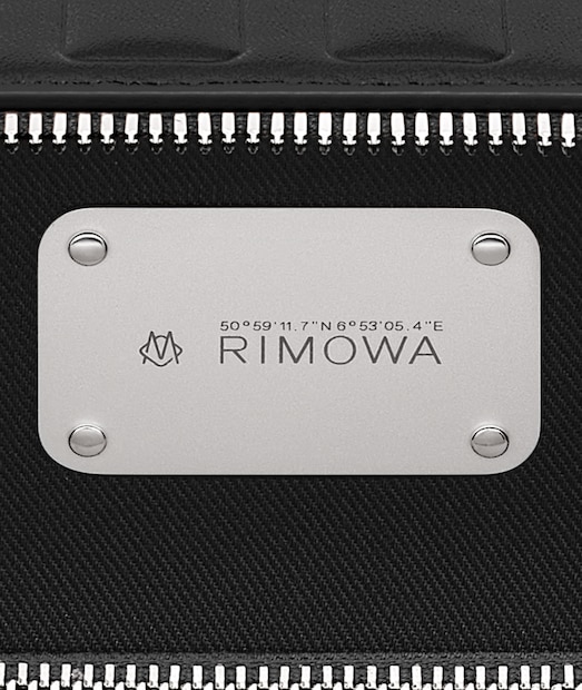 Eine Metallplakette im Inneren der Tasche, befestigt mit vier Nieten, trägt die charakteristischen RIMOWA-Details – Koordinaten und ein Monogramm, das das Design unserer Koffer zitiert.
