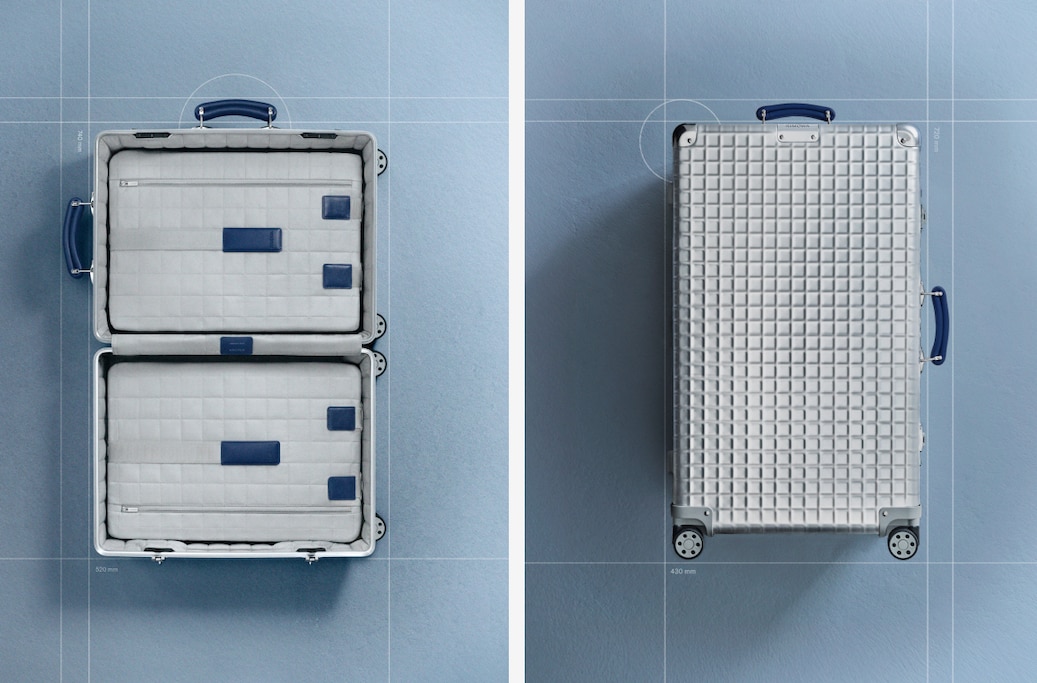 À l’époque, ces pièces incarnaient cet idéal de rigueur et de modularité où la forme se confond avec la fonction. Aujourd'hui, cet esprit se décline sur des coques en aluminium rigide au motif quadrillé : une esthétique géométrique et structurée, fidèle à l’ADN industriel de RIMOWA. À l’intérieur, la doublure matelassée fait écho à ce motif, tandis que les finitions en cuir bleu, les poignées signature, les serrures en palladium et les rivets ornés d'un avion soulignent les origines de la collection. Fabriquée à Cologne, chaque pièce est une édition limitée et numérotée qui remet ce design au goût du jour pour une nouvelle génération de voyageurs.