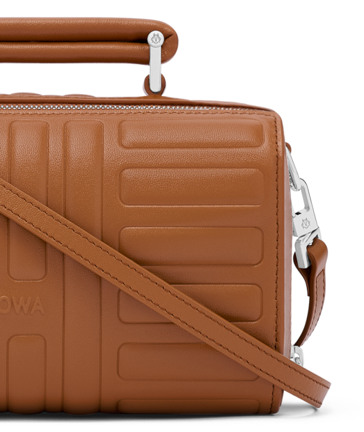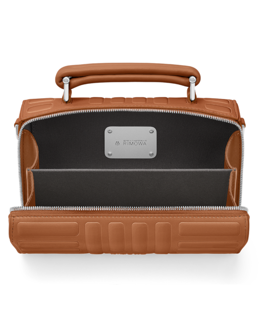 Eine Metallplakette im Inneren der Tasche, befestigt mit vier Nieten, trägt die charakteristischen RIMOWA Details: Koordinaten und ein Monogramm, das das Design unserer Koffer zitiert