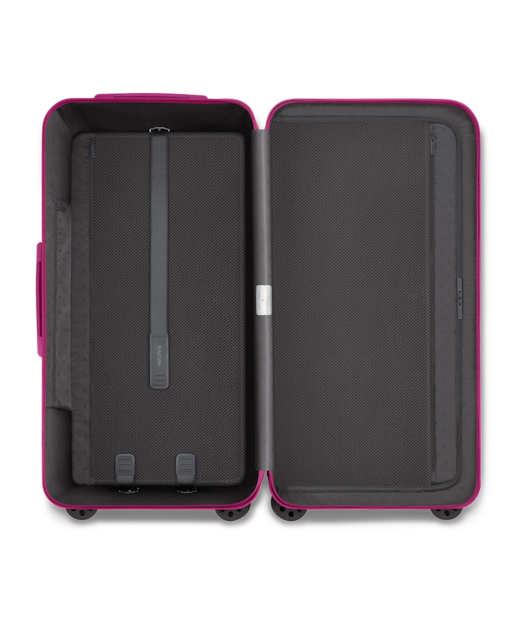 L'intérieur dispose d'un compartiment entièrement zippé, doté d'une grande poche filet avec fermeture Éclair pour offrir une plus grande capacité de rangement. Les articles rangés sont parfaitement maintenus pendant le transport grâce au système de séparation breveté de RIMOWA, le Flex Divider, réglable en hauteur.